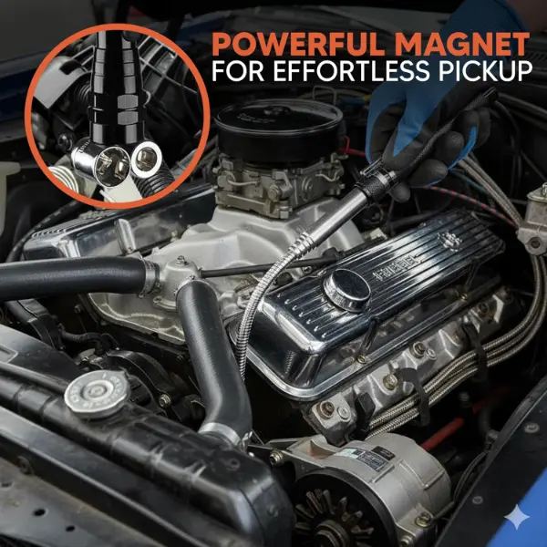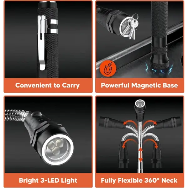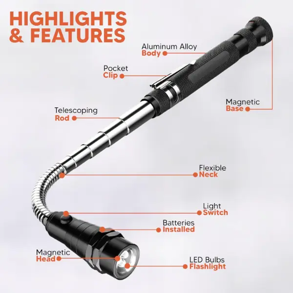 The SAPGIF Telescopic LED Magnetic Pickup Tool is designed to make retrieving small metal objects from hard‑to‑reach places effortless. A flexible telescoping rod extends up to roughly 22 inches and bends 360° to reach awkward angles, while collapsing down to about 6.9 inches for easy storage in a pocket or toolbox. The dual‑head magnet system features a strong magnet on the tip and a powerful magnetic base, each capable of holding small metal parts, so you can pick up dropped nuts, bolts, or screws or attach the tool to a metal surface for hands‑free use.